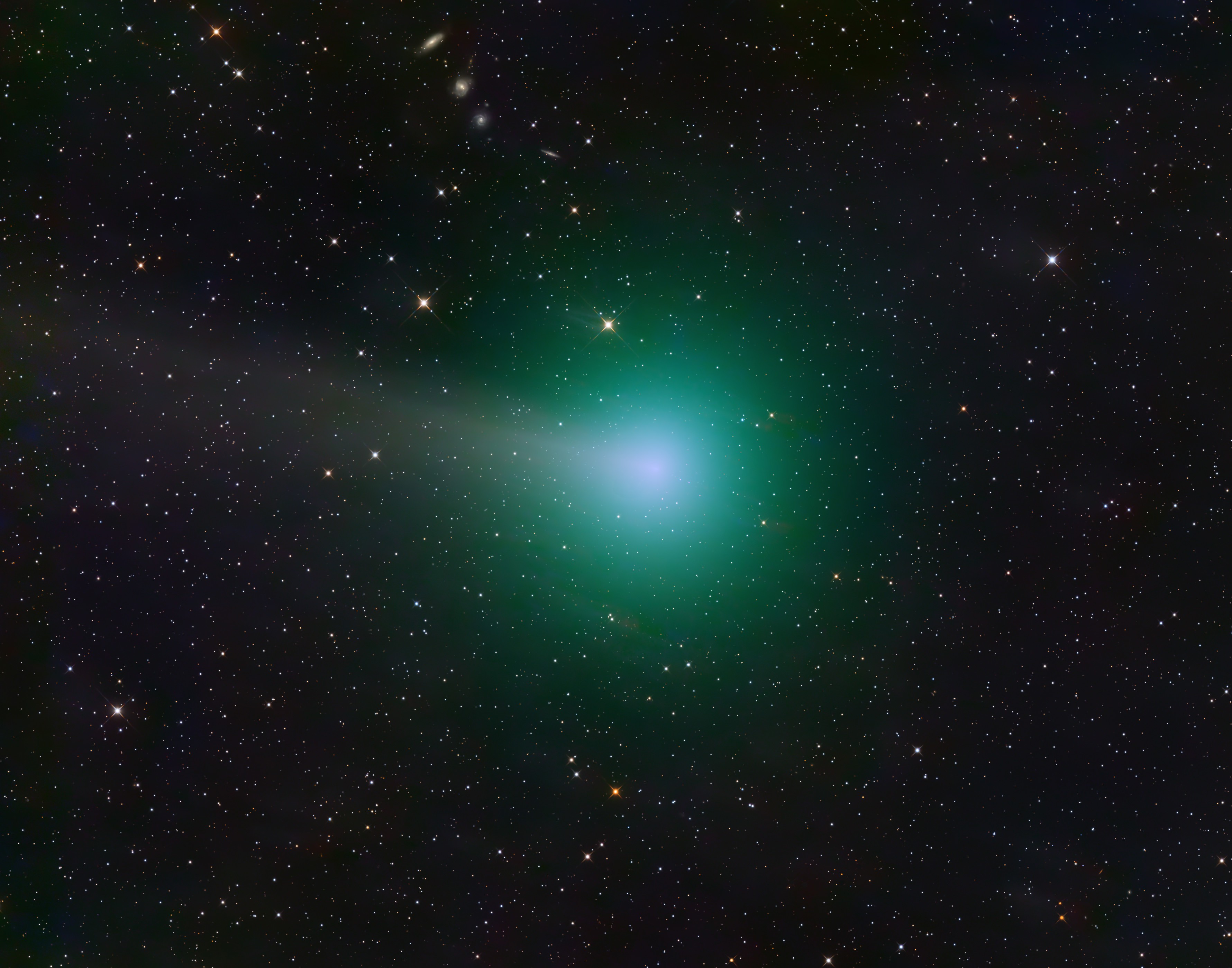 Comet C/2025 R2 (SWAN), obtained on 2025 Oct. 27 (20h02-20h44UT) with 40-cm, f/4.0 Newtonian astrograph and PlayerOne Zeus camera. Exposure time was 15:7:7:7 minutes (36x60 seconds) in LRGB. Image scale is 0.97 arc sec/pixel. Image was taken at E-EYE observatory in Spain. Copyright © 2025 by R. Palcic, Rezman Observatory.