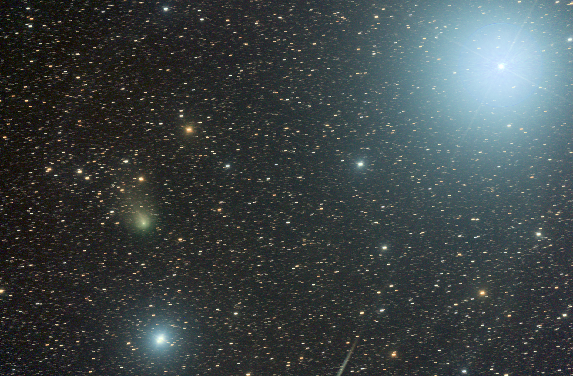 Image of periodic comet 12P/Pons-Brooks, obtained on 2024 Mar. 13 (19h58-20h28UT) in moonlight conditions with 15-cm, f/3.7 Quattro-150P telescope and Canon 700D camera. Exposure time was 51x30 seconds. Image scale is 5.1 arc sec/pixel. Field size 2.5 x 1.6 deg. Image was median combined to weaken the stellar background, eliminate many of the Starlink trails and highlight the structure of the comet tail. Copyright © 2024 by H. Mikuz, Crni Vrh Observatory.