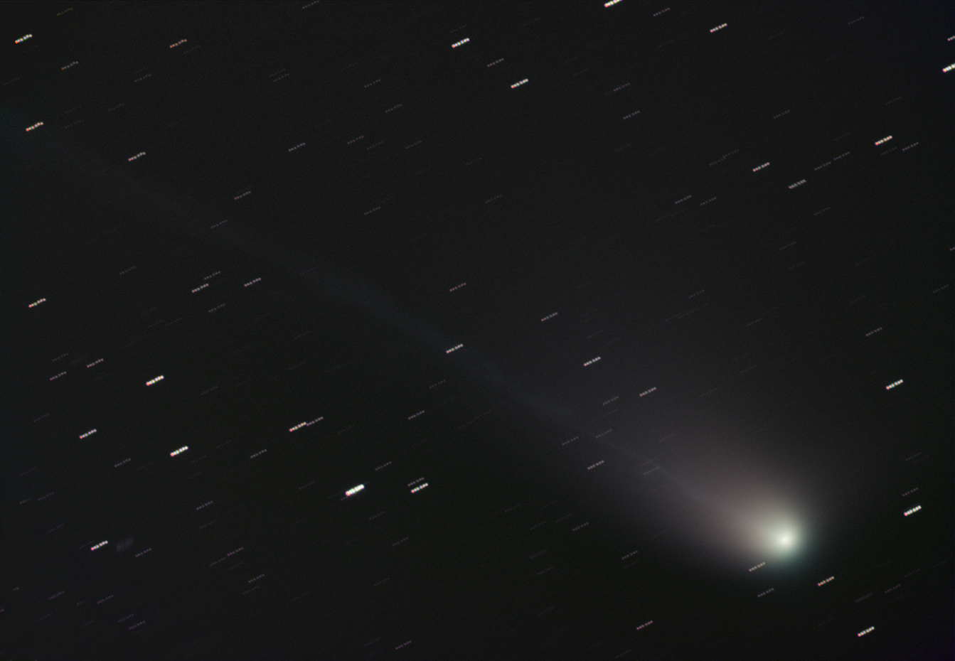 False color image of periodic comet 13P/Olbers, obtained on 2024 June 28 (20h47-21h02UT) with 60-cm, f/3.3 Deltagraph telescope and CMO. Exposure time was 10 minutes (20x30s). Image scale is 1.17 arc sec/pixel. Comet altitude about 13 deg. Copyright © 2024 by H. Mikuz, Crni Vrh Observatory.