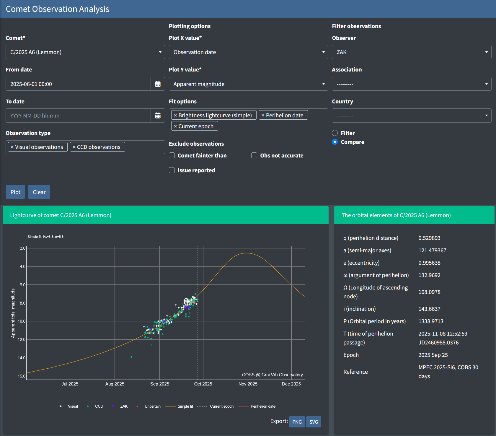 Figure 1: Analysis of observations for comet C/2025 A6 (Lemmon) with observation form user ZAK marked for comparison.