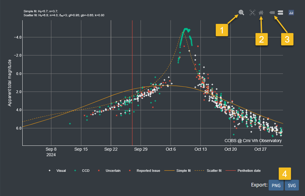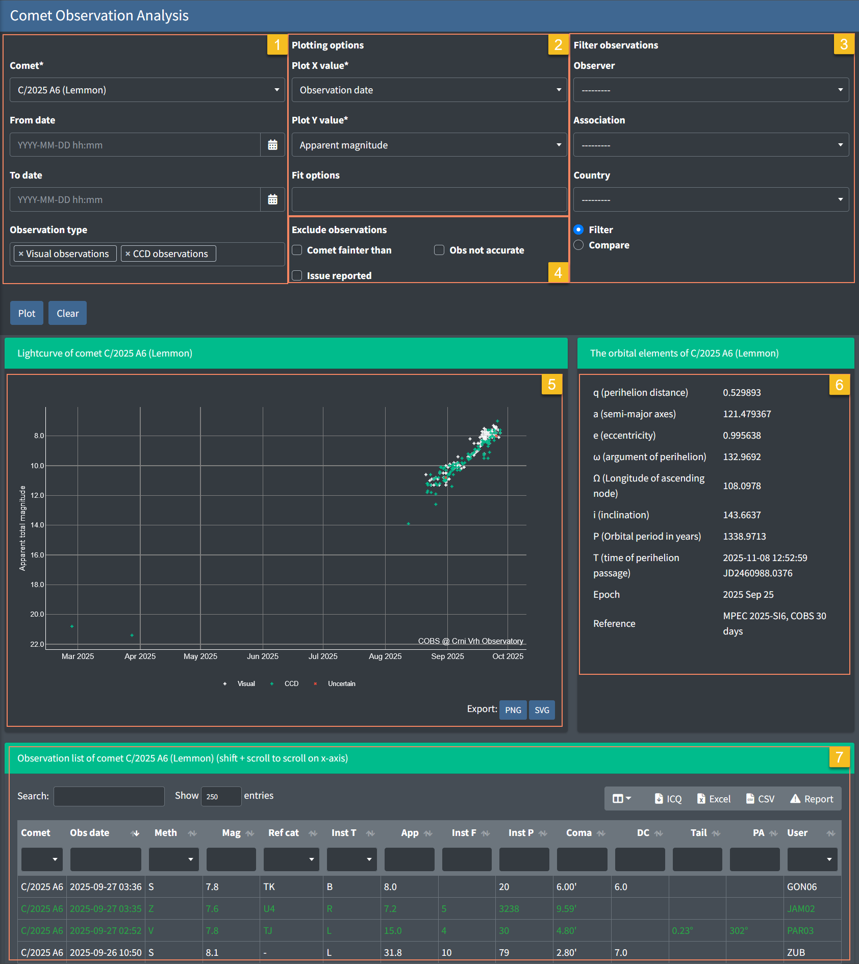 - Selection Panel (top left) – Choose the comet, date range, and observation type.