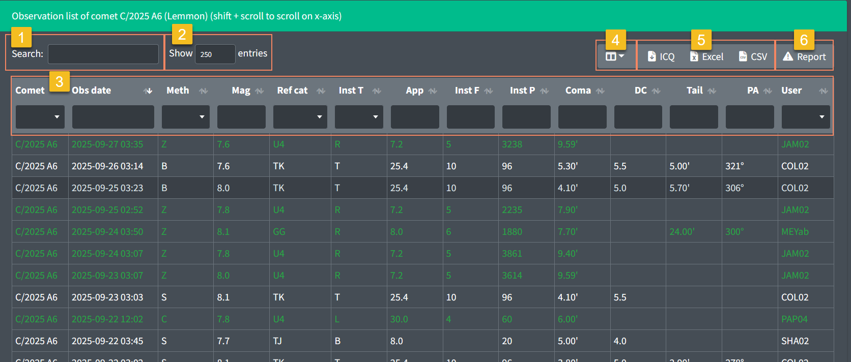 - Search box – type any text (e.g., date, observer code, magnitude) to quickly filter rows that match your query.