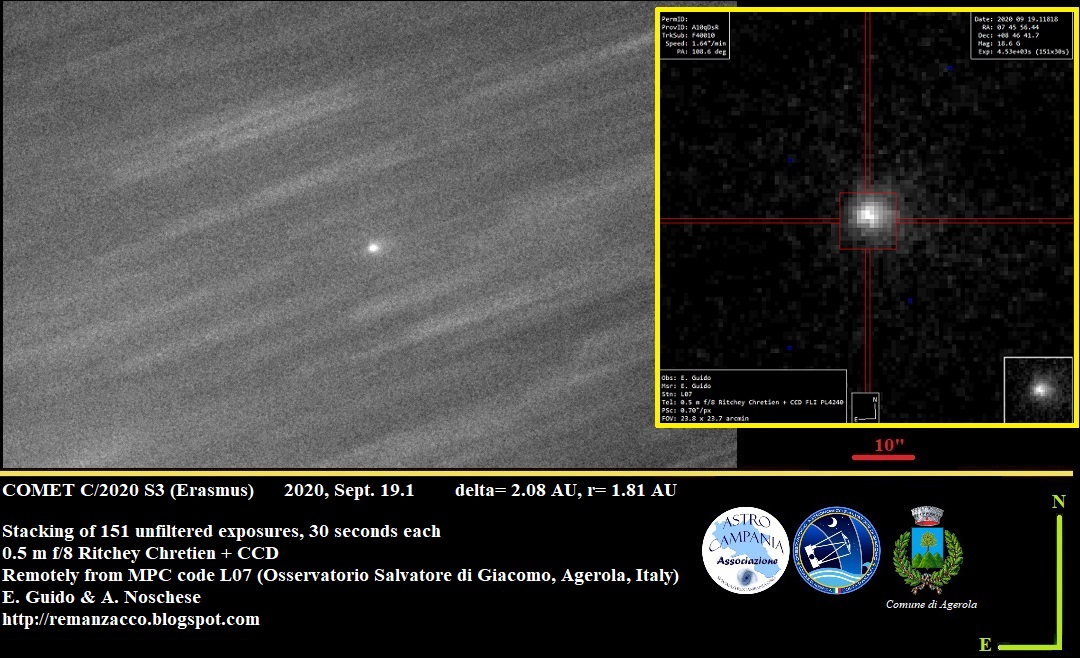 Stacking of 151 unfiltered exposures, 30 seconds each, obtained remotely on 2020, September 19.1 from L07 (Osservatorio Salvatore di Giacomo, Agerola) through a 0.5 m f/8 Ritchey Chretien + CCD FLI PL4240, shows that this object is a comet with a diffuse coma about 20" in diameter.